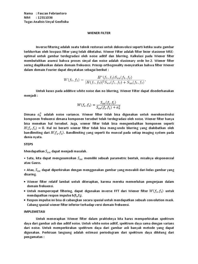 Wiener filter adalah. Sala satu diperoleh 25. Dalam melakukan dekonvolusi terdapat beberapa metode dimana metodenya yaitu metode optimum wiener filter. Prinsip orthogonality menyiratkan bahwa filter Wiener dalam domain Fourier dapat dinyatakan sebagai berikut.